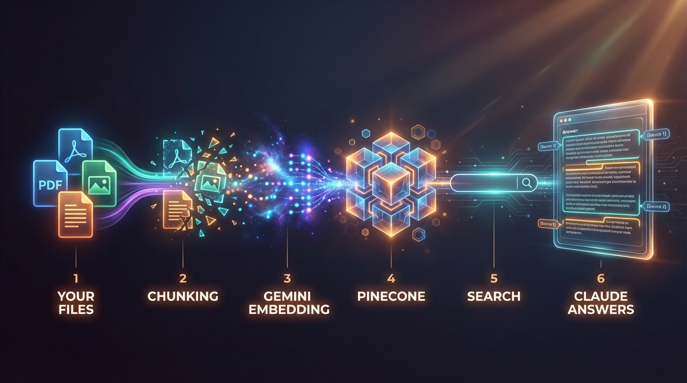 The full pipeline: files are chunked, embedded by Gemini, stored in Pinecone, then Claude answers your questions using the retrieved content. Click to enlarge.